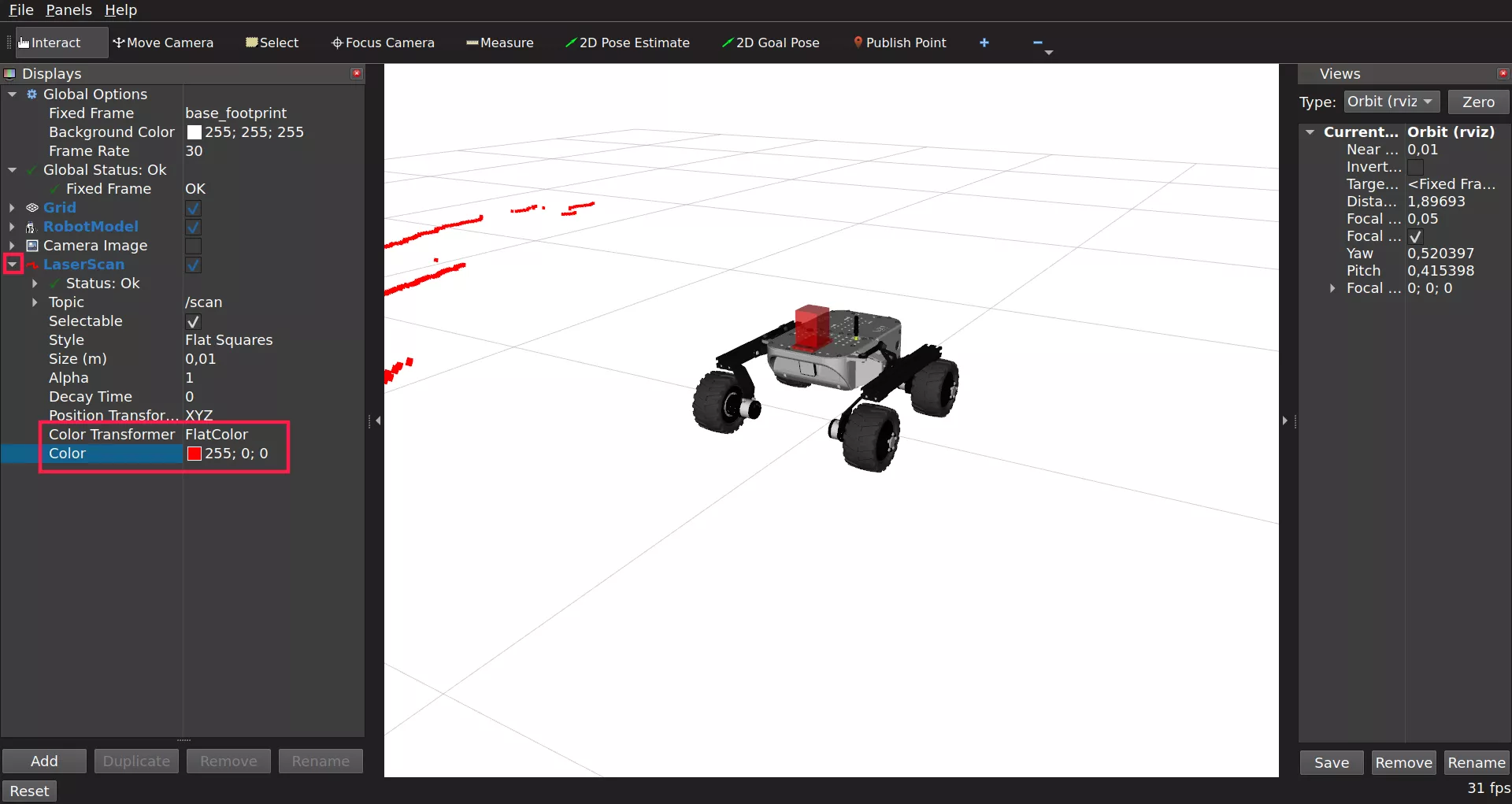 Sometimes the scan data might not be visible as it will melt with the background. To fix this you need to change the color of the displayed laser. To do so, use the drop down arrow option from added LaserScan and set Color Transformer to FlatColor. As you do so, there will appear Color option which you can use to change the displayed laser.