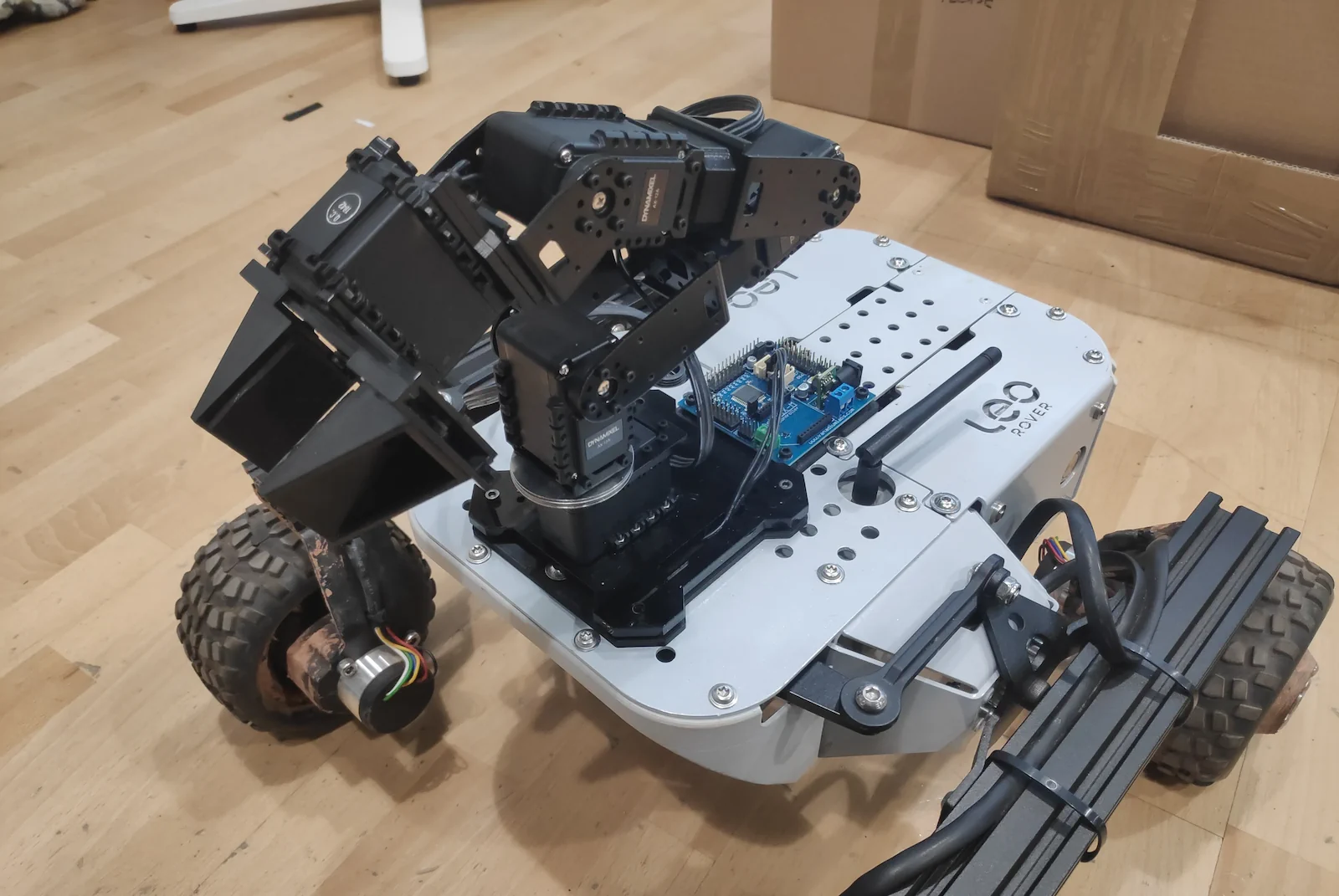 You'll follow the official instructions from Trossen Robotics' website to assemble the arm with only few exceptions that are specific to Leo Rover mounting interface.