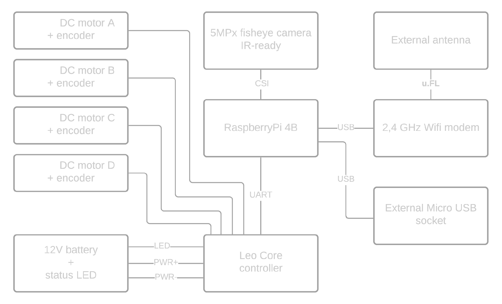 LeoCore is the main control board of the Leo Rover platform, responsible for power distribution, motor control, and communication with the onboard Raspberry Pi computer. Equipped with an STM32F401 microcontroller, it provides robust protection, precise motor drivers, and expandable I/O ports — making it a reliable foundation for robotics research, education, and prototyping.